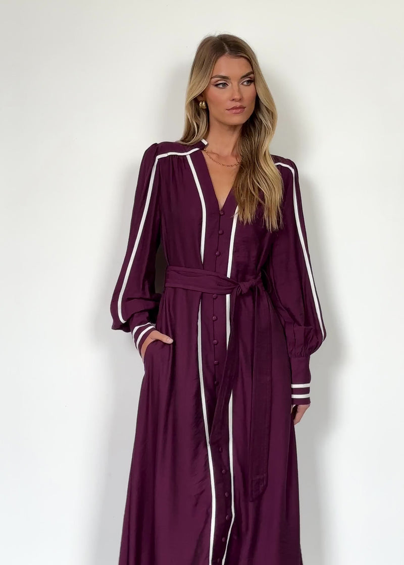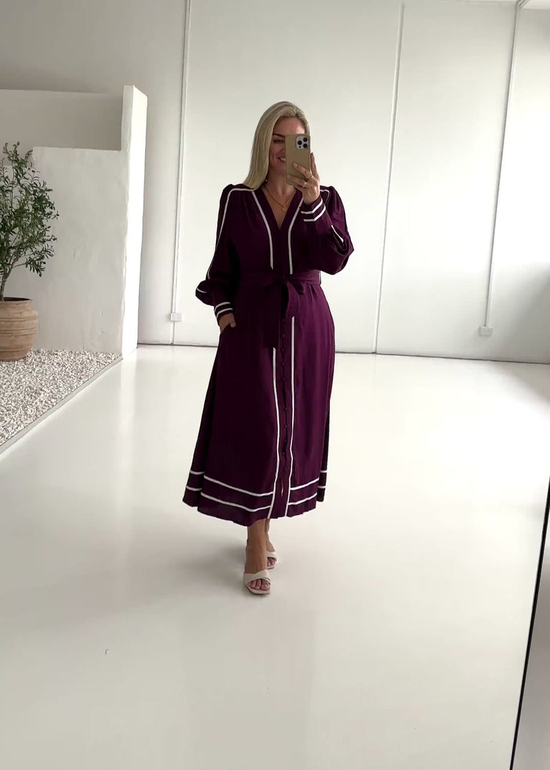 Say hello to effortless elegance with the Melody Maxi Dress in plum. Add ankle boots and a tote for daytime or go dinner-ready with a clutch and gold accessories.