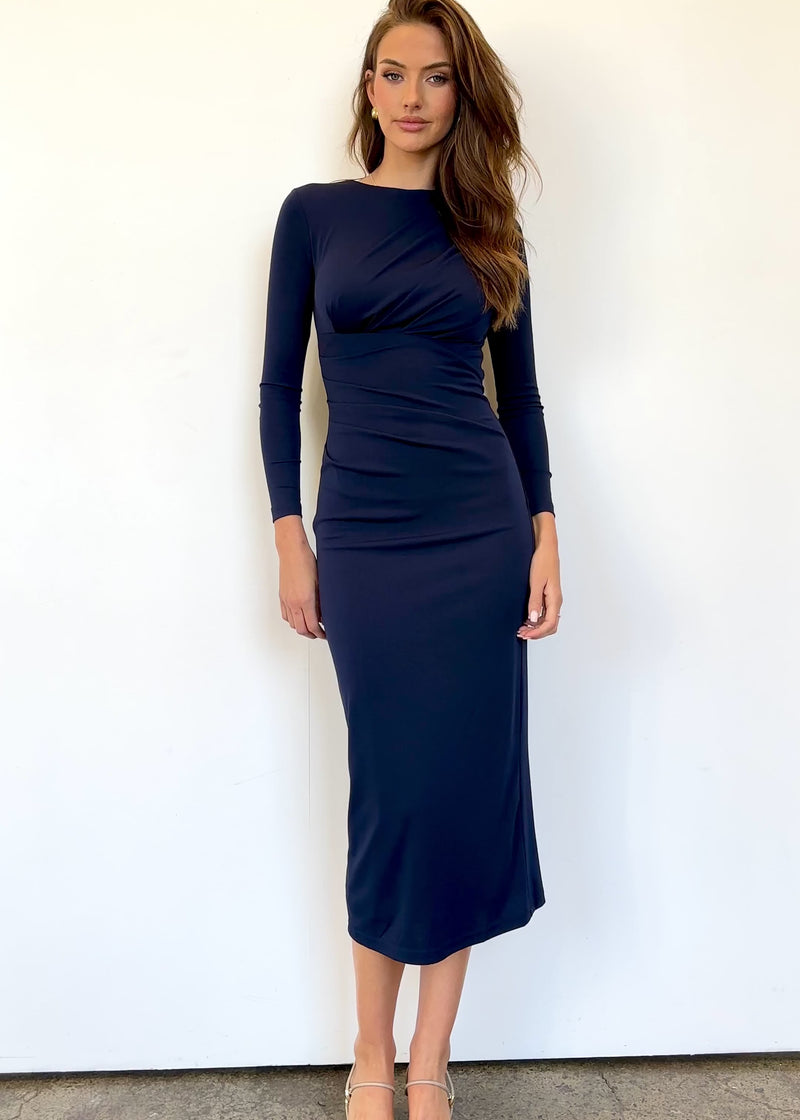 The Midas Dress in navy is understated elegance. With its flattering neckline and fluid skirt, it’s a timeless pick for any semi-formal event. Add nude heels, gold jewellery and a soft wave to complete the look.