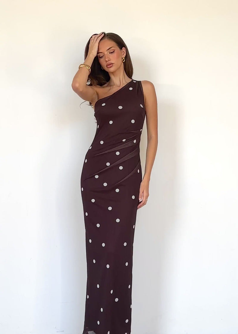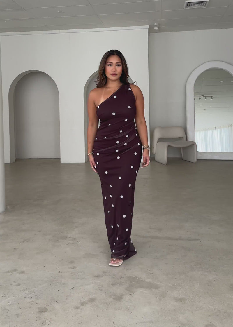 Chic and striking, the Mikah One Shoulder Maxi Dress in choc spot design is made for bold evenings. Pair with strappy heels, a statement cuff and a minimalist clutch.