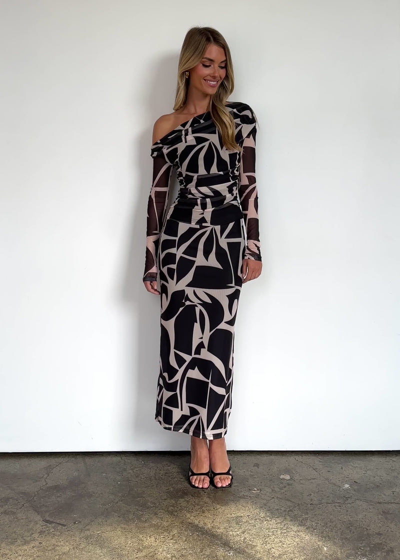 Make a statement in the Mimi Mesh Maxi Skirt in Black Abstract. Style it with a fitted black top or the matching mesh blouse. Add strappy heels, a mini bag and bold earrings for a sleek, elevated look.