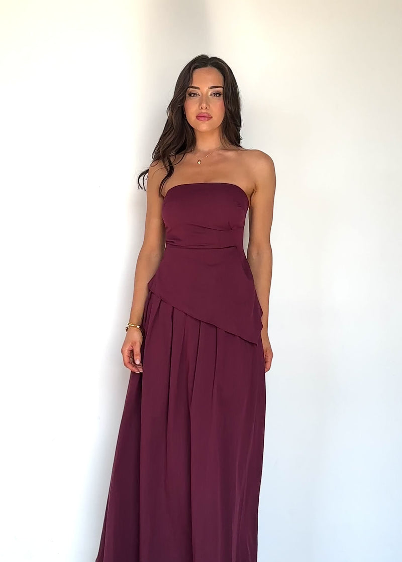 Bold yet feminine, the Miriam Set - Wine features a strapless asymmetric top with a flowing maxi skirt—made to be worn together for a sleek evening look. Style the top with tailored trousers or the skirt with a silk blouse for endless mix-and-match options.