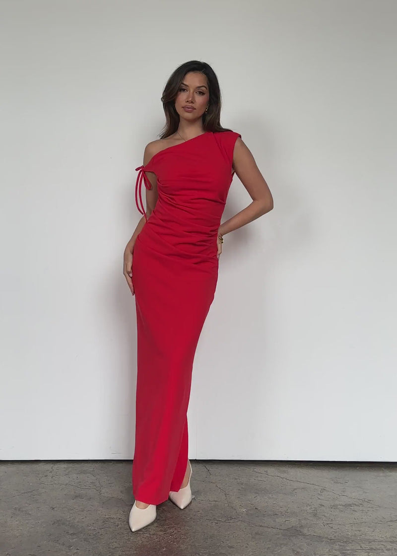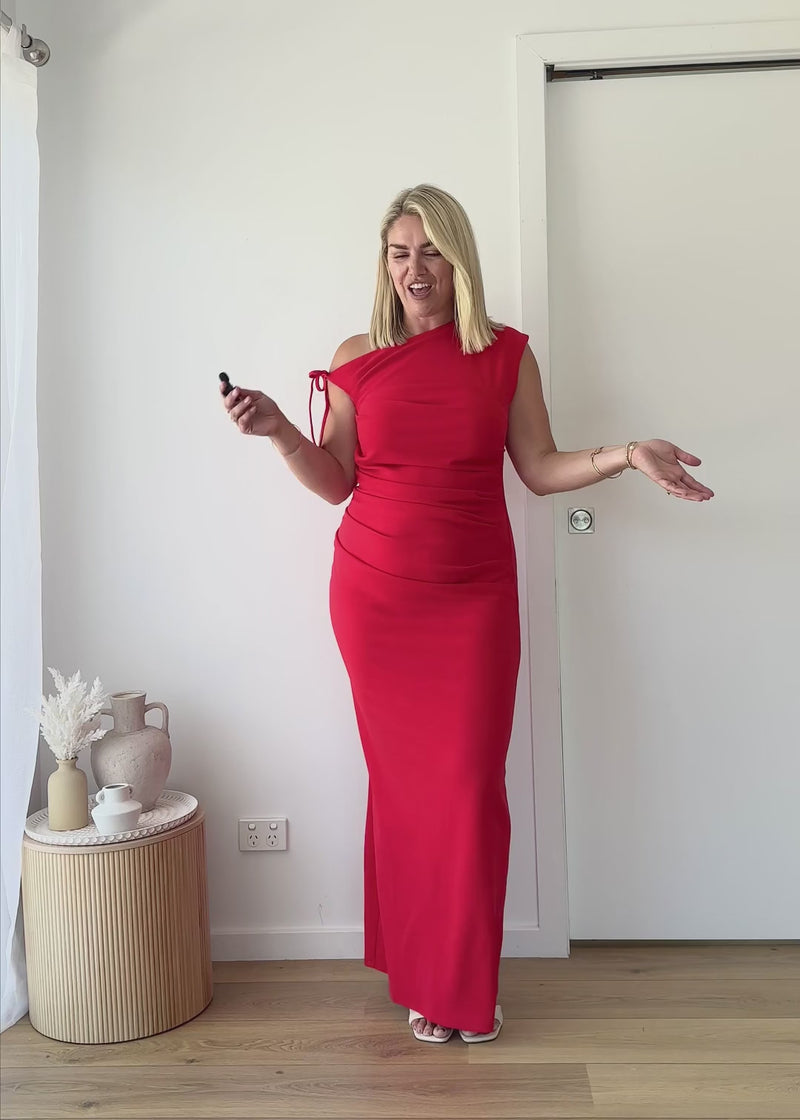 Make a statement in the Mysha Drop Shoulder Maxi Dress in red. Style with block heels and bold earrings for date nights, or grab the matching knit and sneakers for casual cool.