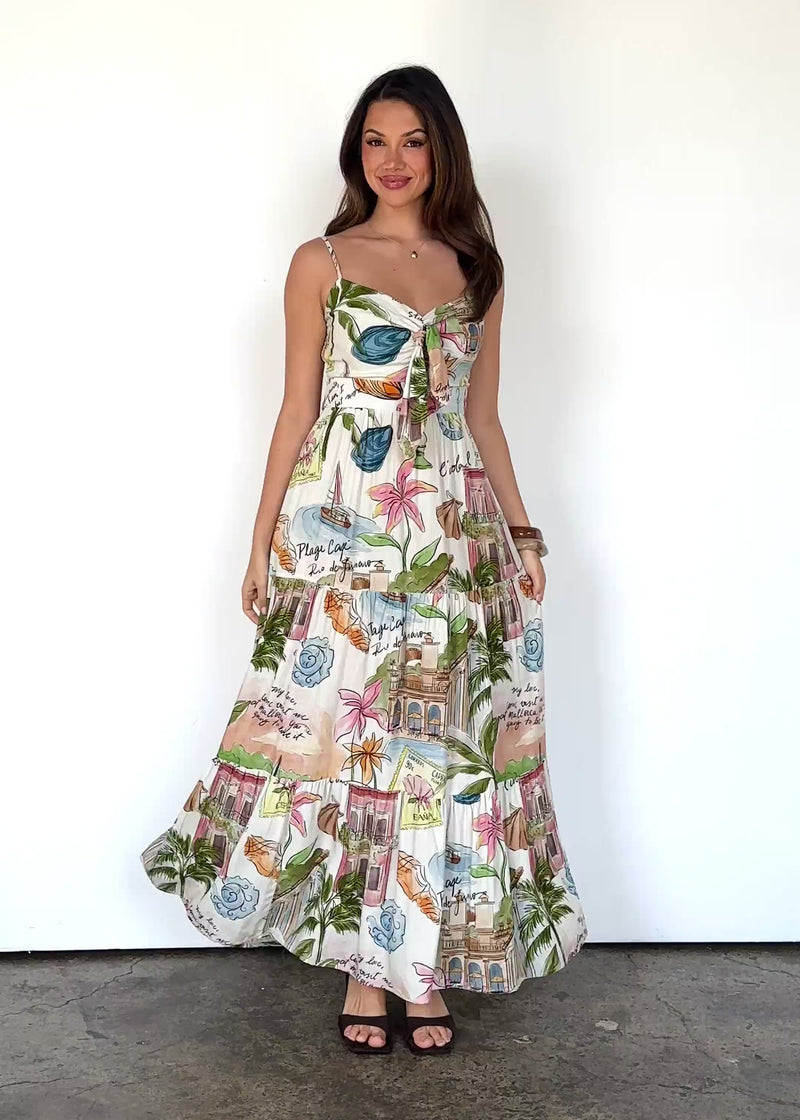 Vibrant and flowy, the Narla Maxi Dress in Capri print is perfect for summer getaways. Pair with sandals and a straw hat for a holiday-ready vibe.