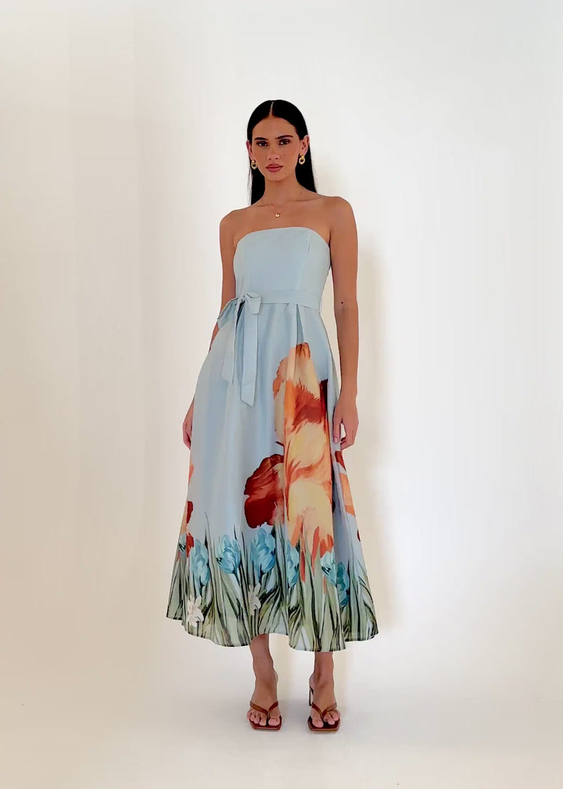 Turn heads at every sunset moment with the Naya Strapless Midi Dress in sky floral.