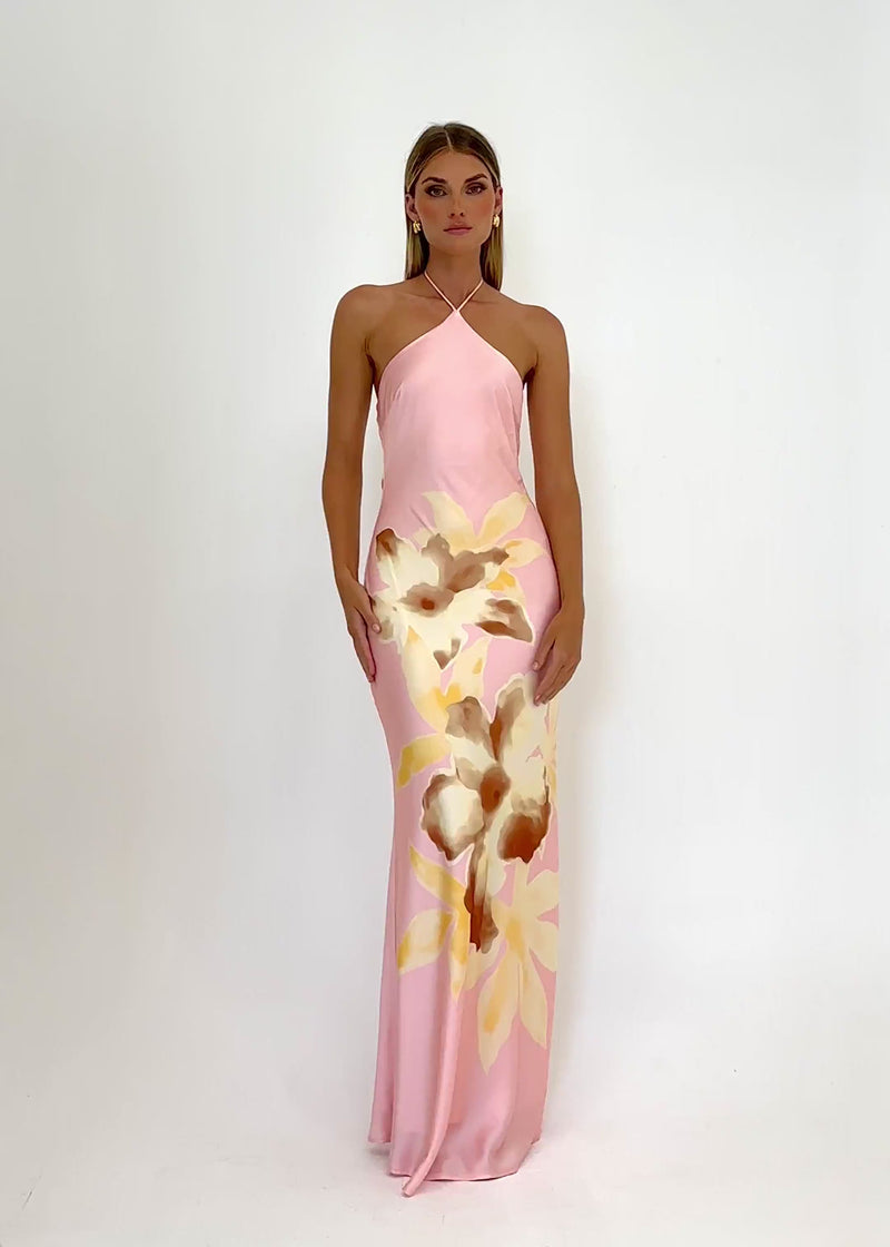 Soft florals meet effortless elegance in the Neisha Halter Maxi Dress – Pink Floral, perfect for garden parties, brunch dates, or sunny celebrations. Style with nude heels, gold jewellery, and a mini clutch.