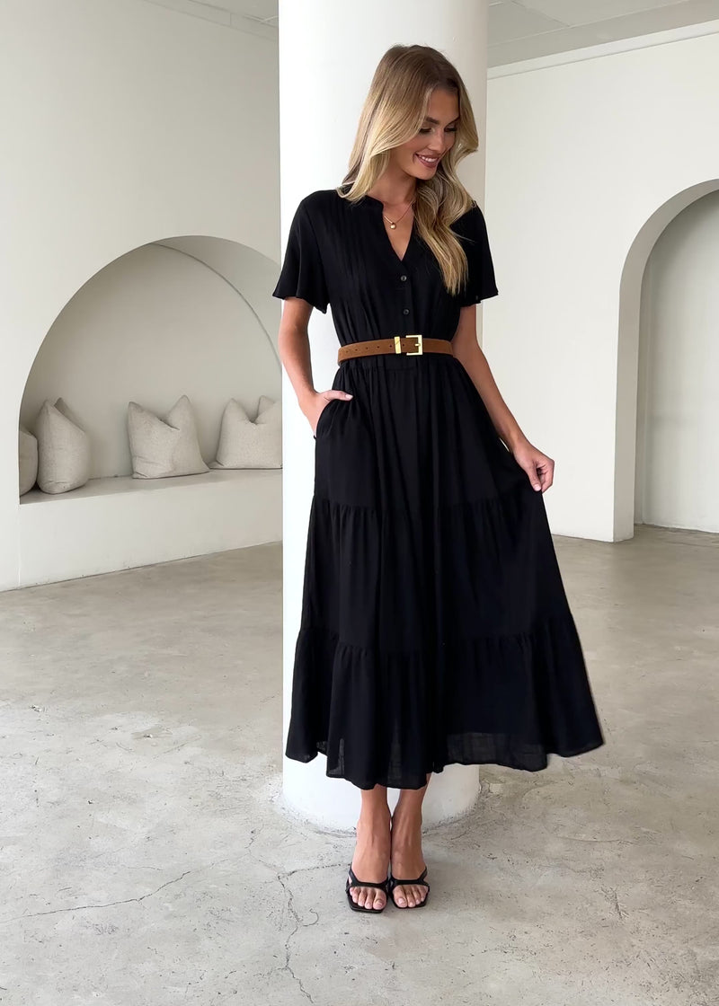 Turn heads in the Niaomi Maxi Dress in Black. A sleek ponytail with a gold barrette, minimalistic jewellery, and metallic heels make this the ultimate versatile outfit. Complete with a structured bag for added finesse.