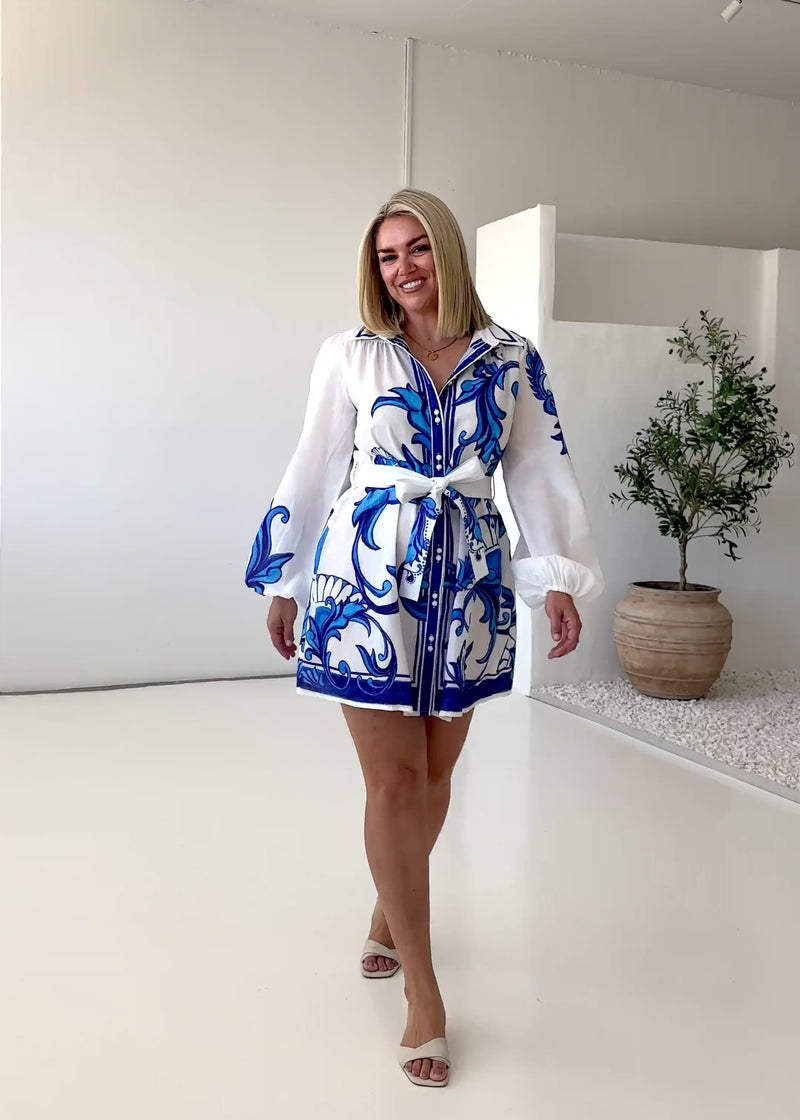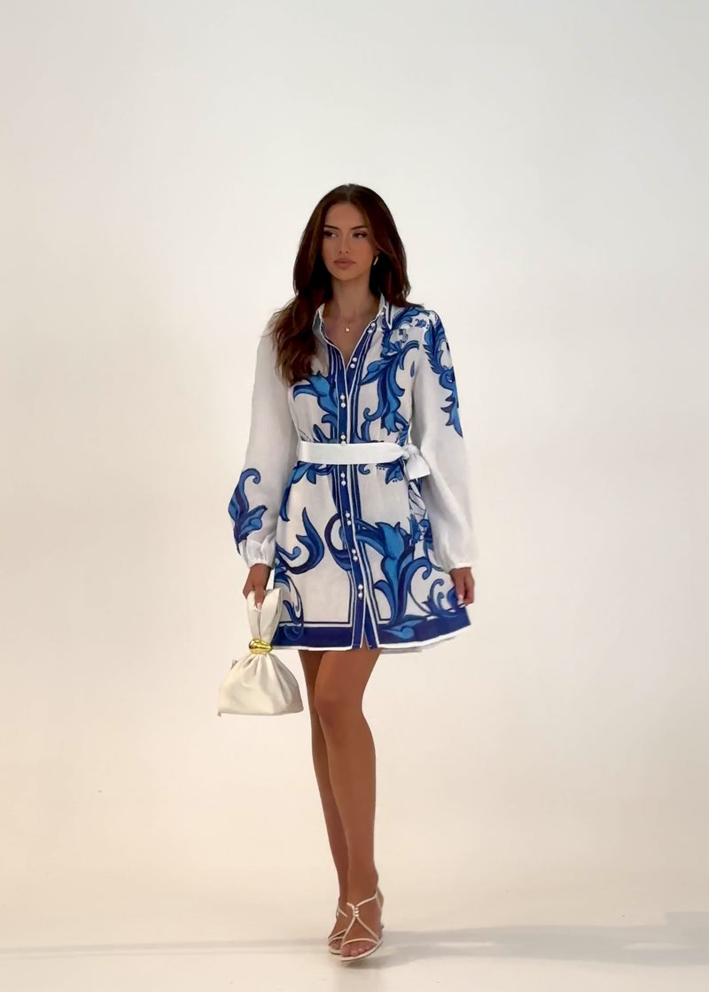 Brighten up your wardrobe with the Nicoletta Dress in Blue Zayna. The vibrant pattern pairs beautifully with minimal accessories—think nude heels and a soft clutch for a clean finish.