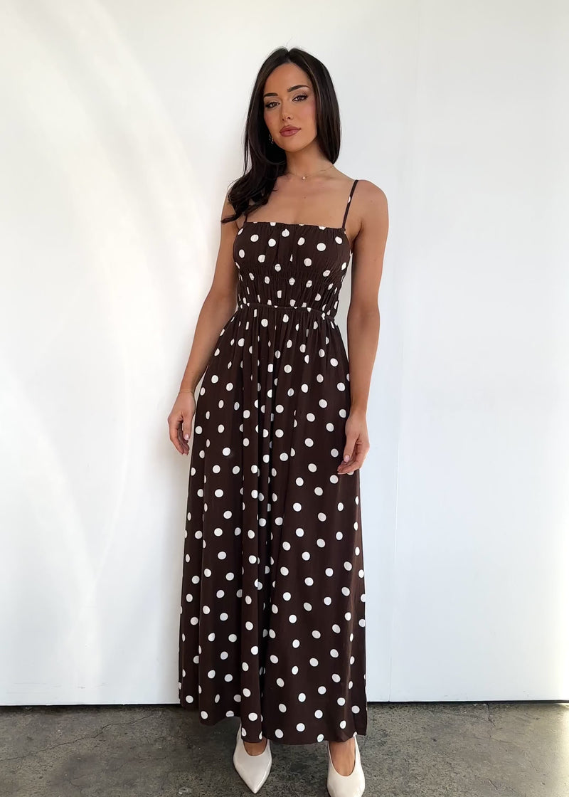Playful yet refined, the Nina Maxi Dress - Choc Polka is perfect for brunch with espadrilles or evening dinners with strappy heels and statement earrings. A dress that’s always in style.