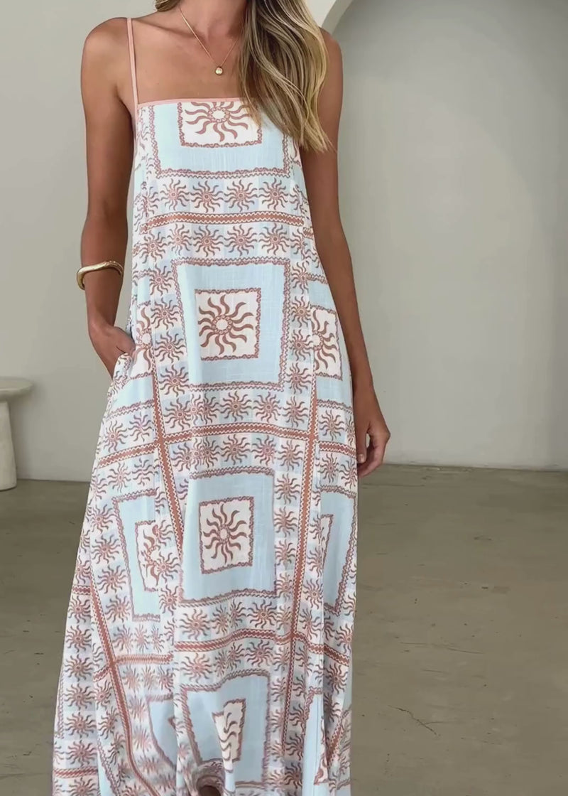 For a refined, effortless look, the Odette Maxi Dress in Blue Flores is a must-have. Style with a sleek ponytail, delicate strappy sandals, and layered gold necklaces. Complete the outfit with a matching clutch for an elevated finish. Own this stunning dress—shop now!