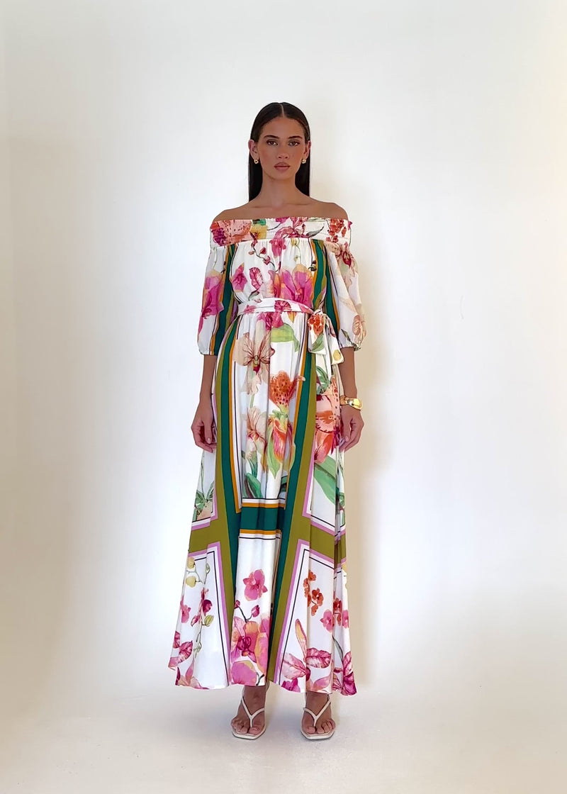 Bold florals meet graceful styling in the Oriel Off Shoulder Maxi Dress in Botanical Garden. Ideal for parties and outdoor events, wear with heeled sandals, gold jewellery, and a top-handle bag for a refined, standout look.
