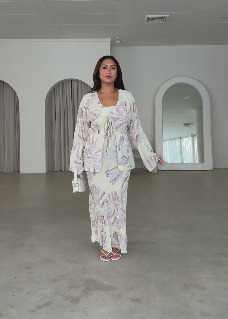- Features: Flare sleeves, Front tie detail, Front split