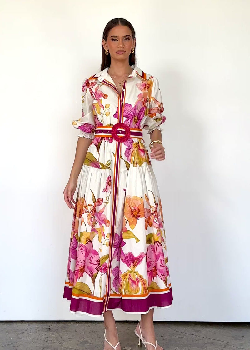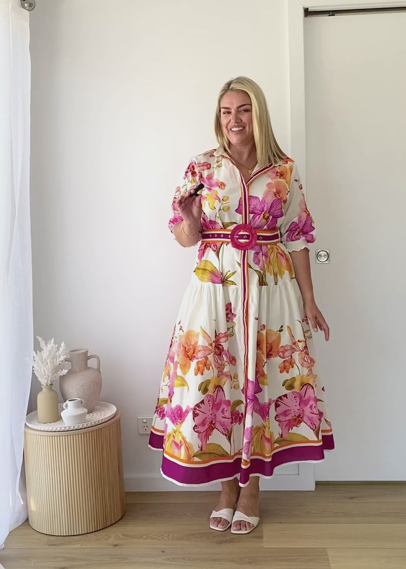 Turn heads in the Pabla Maxi Dress in Fuchsia Orchids. Its flowy silhouette and bold print make it ideal for brunch plans or garden parties. Style it with wedges, soft curls, and minimal gold jewellery for that effortless glow-up look.