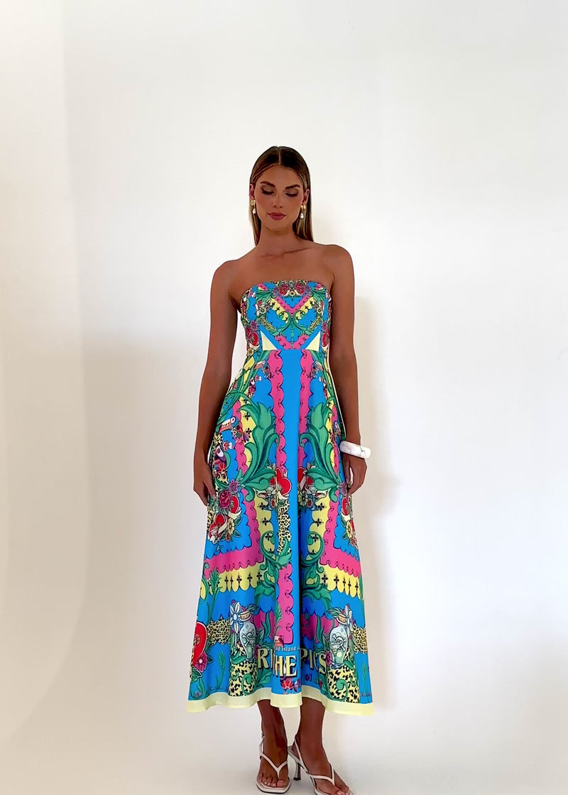 Vibrant and playful, the Strapless Midi Dress in Rio Tropics is made for resort getaways or summer parties. Pair with wedges, a basket bag, or hoops for a daytime look, or elevate with heels and a clutch for evenings. Add matching accessories for a polished finish.