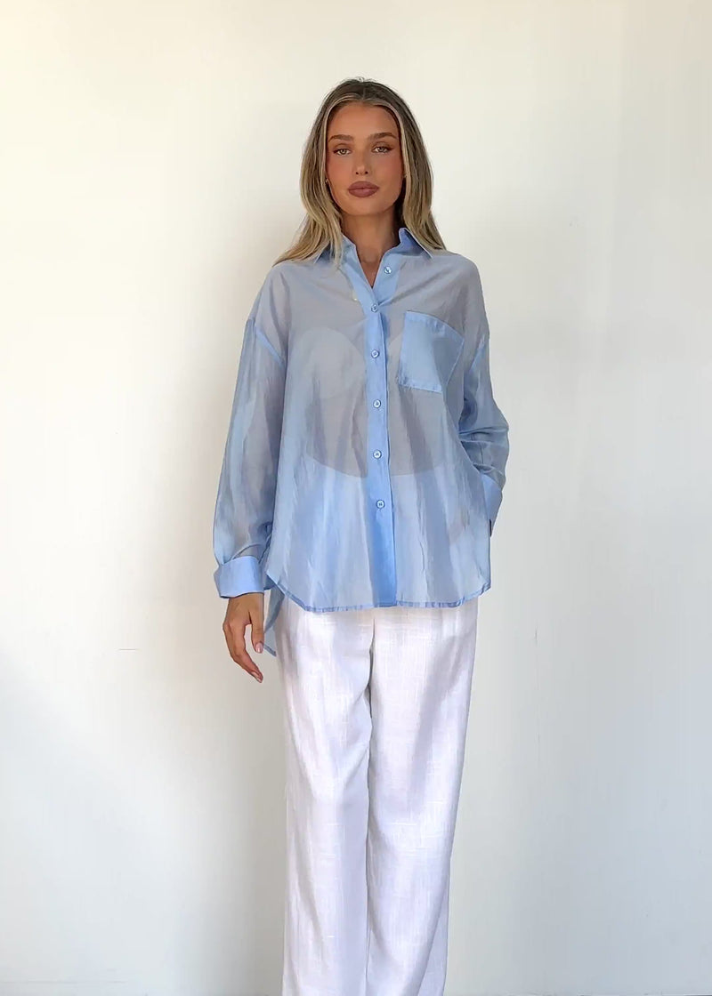 Fresh sky blue tones brighten your everyday look. Style with white trousers, denim, or skirts. Porsia Shirt keeps things light, clean, and easy to wear.