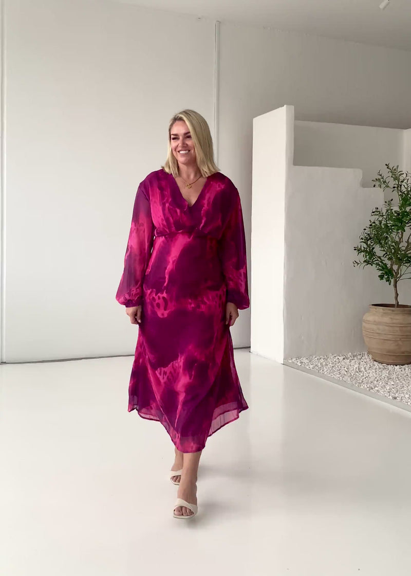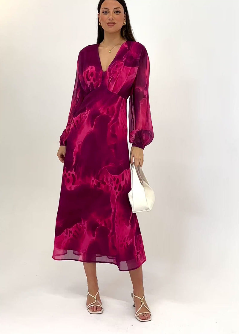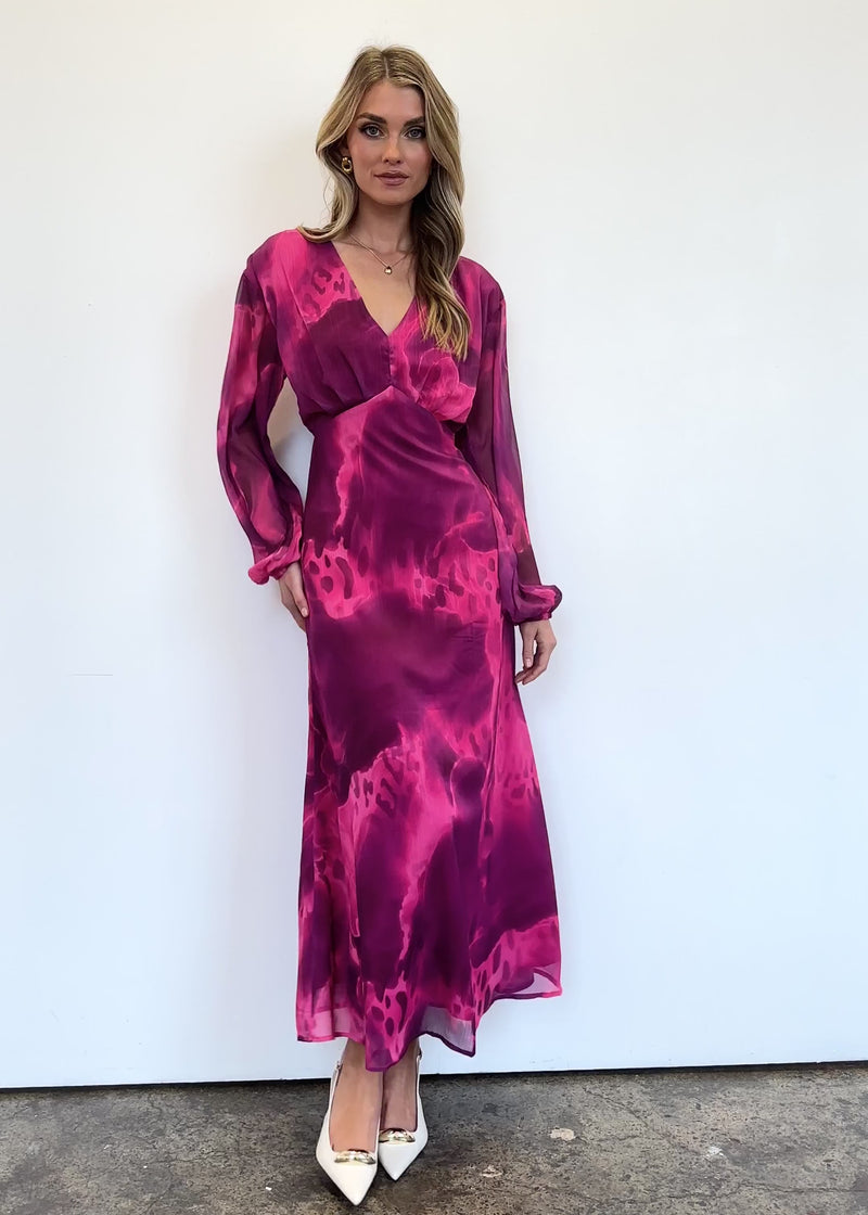 Romantic in print and floaty in feel, this pink splash maxi dress calls for soft waves, strappy heels and a micro bag. Ideal for brunches, garden parties or date nights.