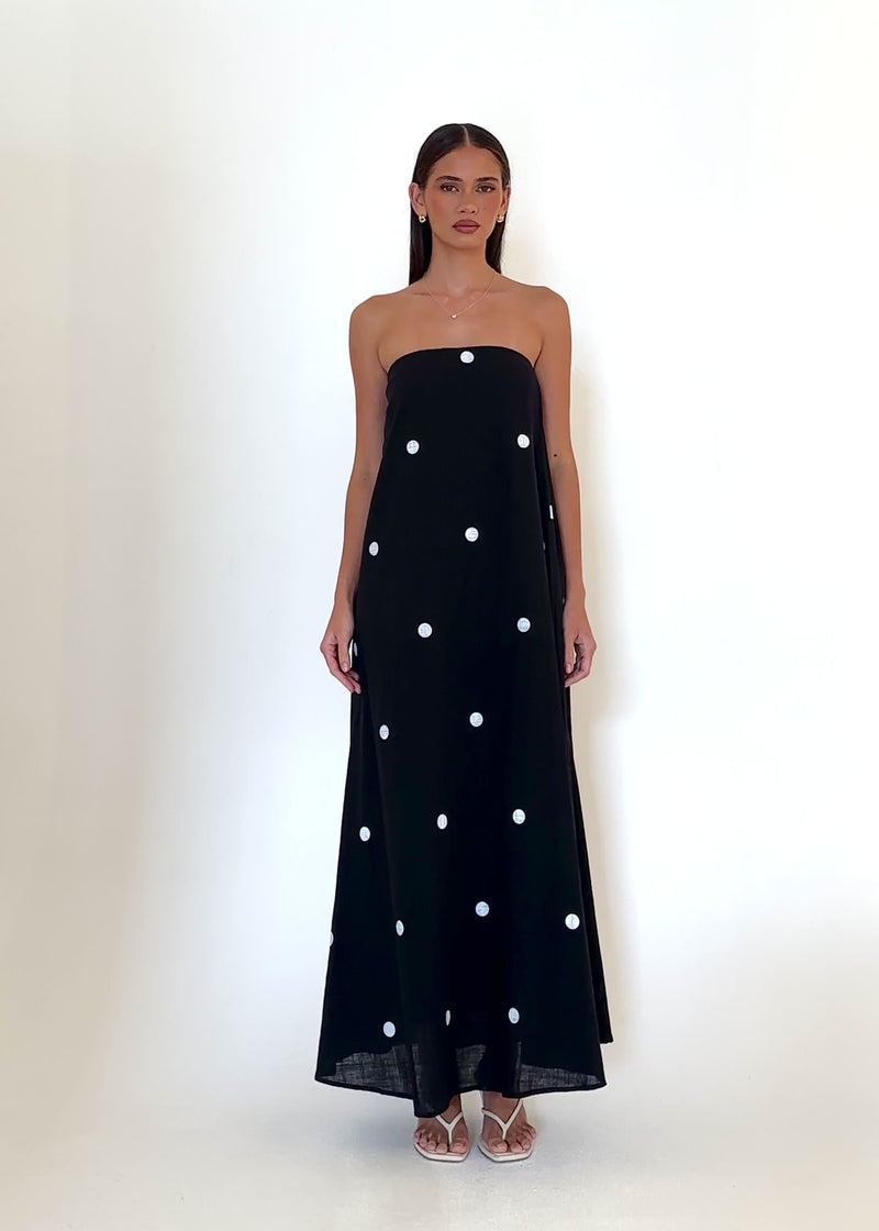 Classic print meets modern elegance in the Remora Strapless Maxi Dress in Black Polka. Style with strappy heels, bold earrings, and a clutch for parties, dinners, and evening events.