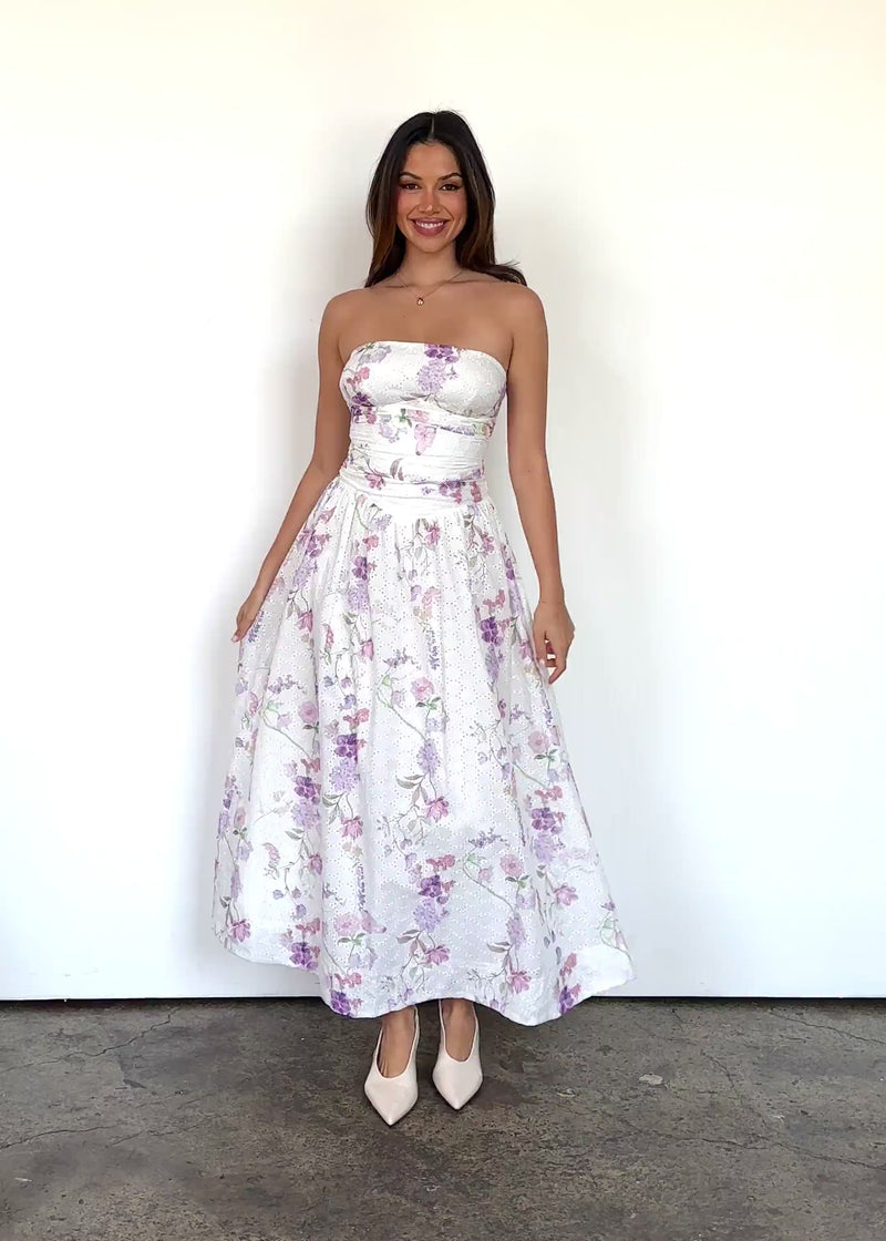 A sweet blend of charm and grace, the Rena Strapless Maxi brings a breezy vibe in a soft lavender floral print. Just add a straw hat and slides for an easy daytime look, or heels and a clutch for a dinner date.