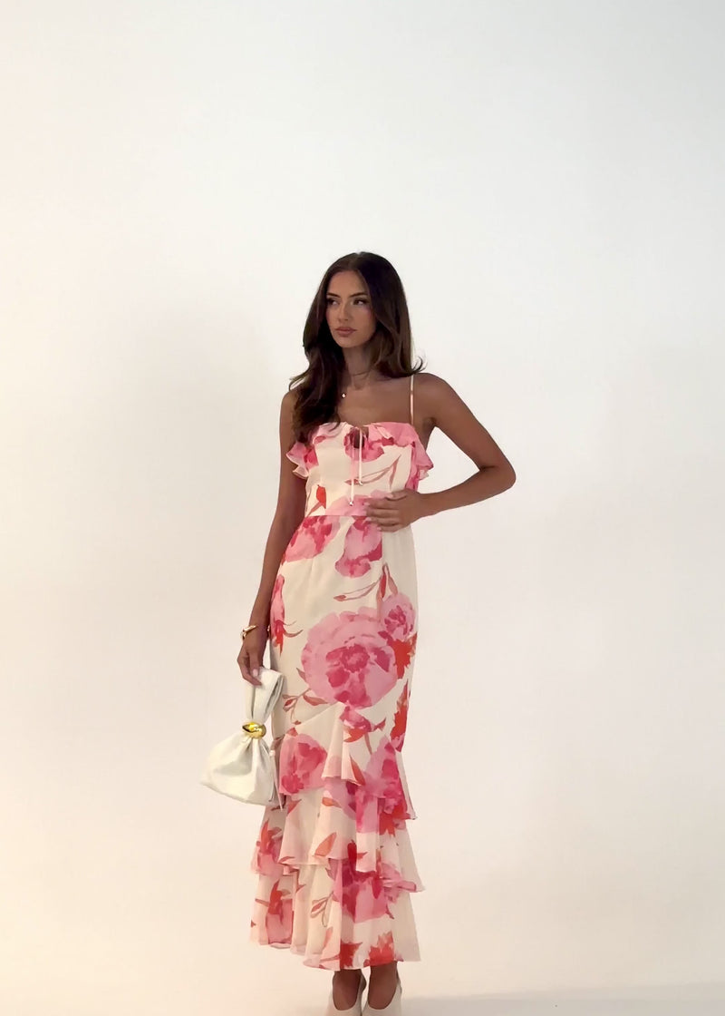 Soft and romantic, the Renn Maxi Dress - Pink Bloom pairs perfectly with strappy heels and a clutch for weddings or flat sandals and a crossbody for weekend strolls. Its breezy flow and floral print make it a versatile summer statement.