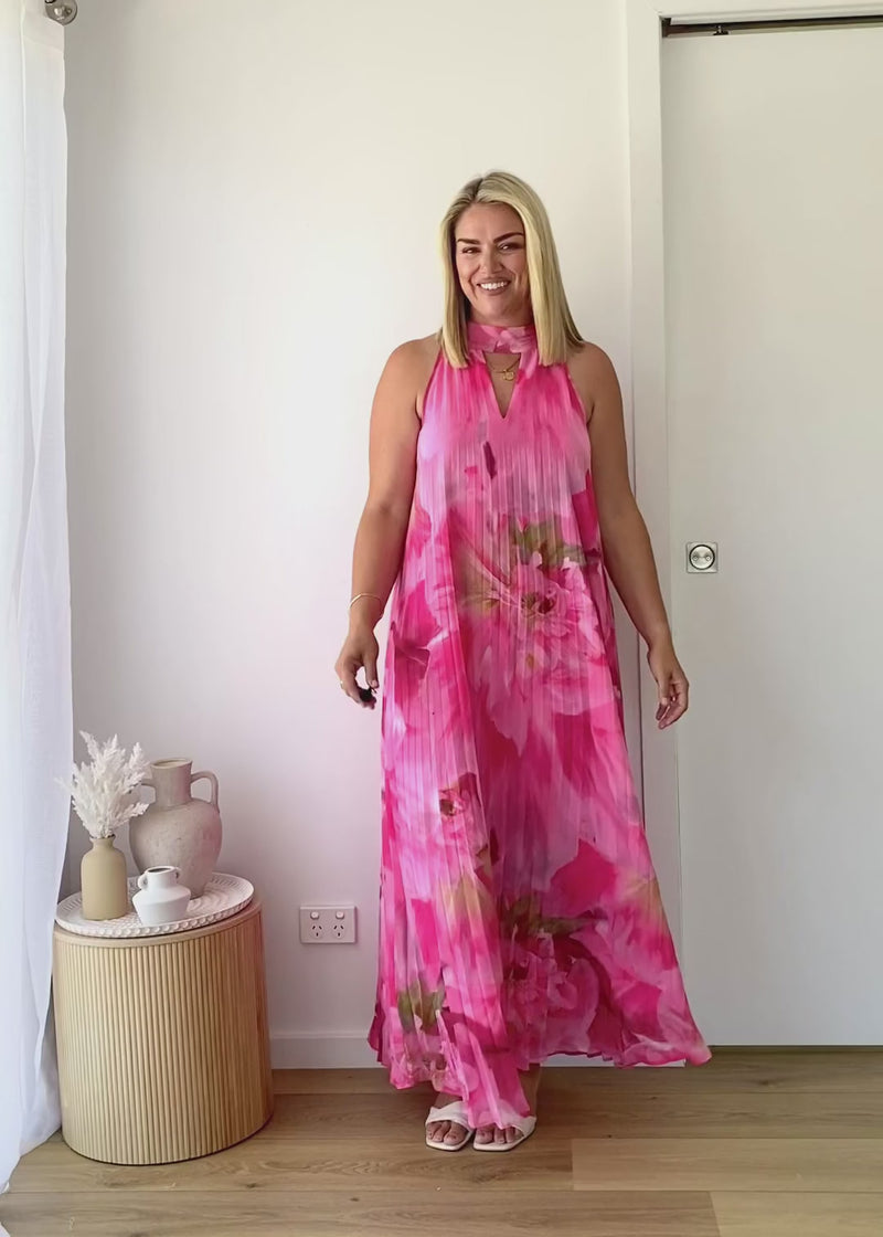 - Features: Fixed halter neck with button closure, Keyhole detail, Pleated