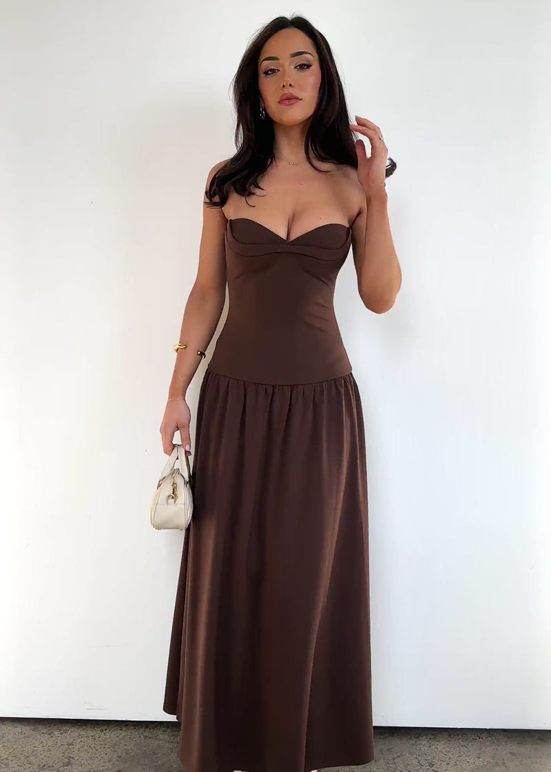 Bold and flattering, the Rheanna Strapless Midi Dress - Chocolate pairs with gold accessories and heels for evening glam or flat sandals for daytime ease. A statement dress for every occasion.
