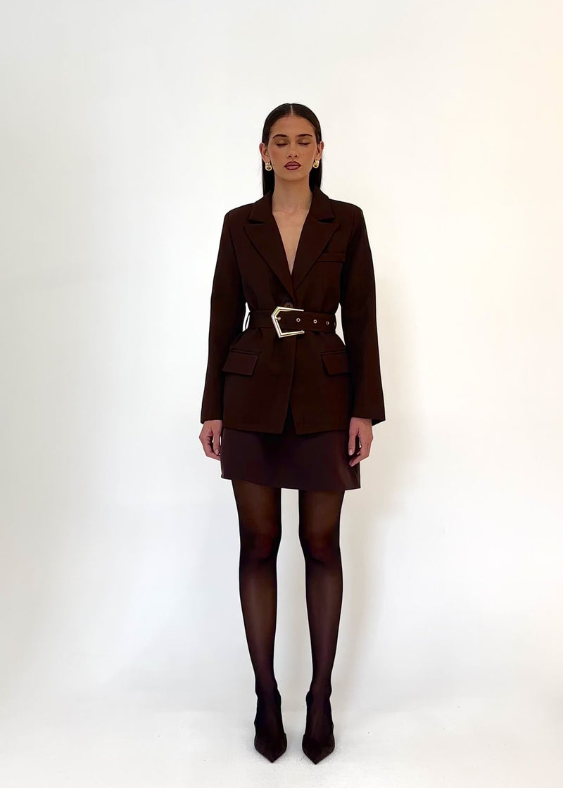 Soft chocolate tones add warmth to this tailored blazer. Style with matching trousers or denim for a balanced look. Rhyzel Belted Blazer brings structure and elegance to both casual and formal outfits.