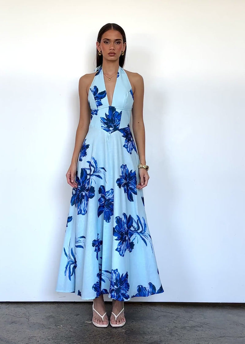 Soft, flowy, and effortlessly pretty—the Ricky Halter Maxi Dress in Blue Flowers is perfect for daytime picnics or resort lounging. Add slides and sunnies for a breezy finish.