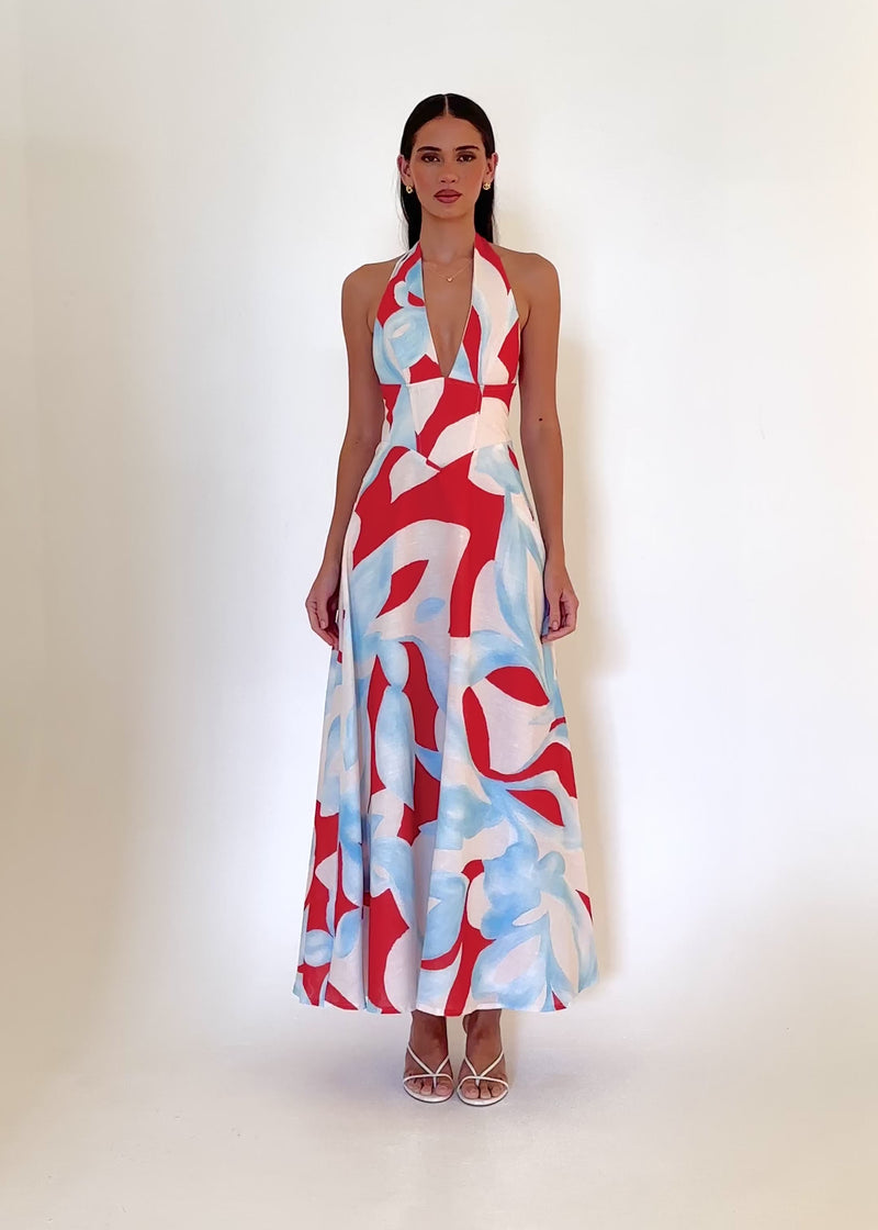 Ignite a bold energy wearing Ricky Halter Maxi Dress - Red Abstract for your next summer celebration. A striking abstract print and daring halter neckline create a high-fashion silhouette that demands attention in the best way possible. Pair this with gold hoops, red strappy heels, and a clear acrylic clutch for a fiery, modern finish.