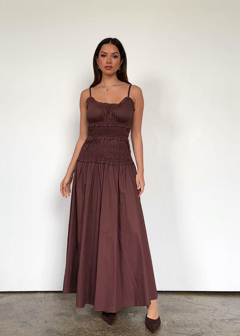 The Rihana Maxi Dress in chocolate brings understated elegance into your rotation. Style with nude straps and a metallic clutch for evening glamour, or blazer and loafers for relaxed city days.