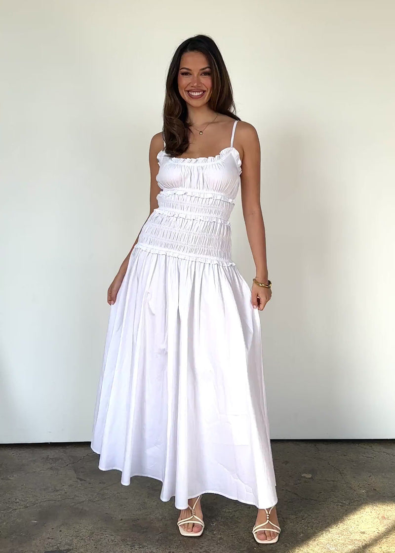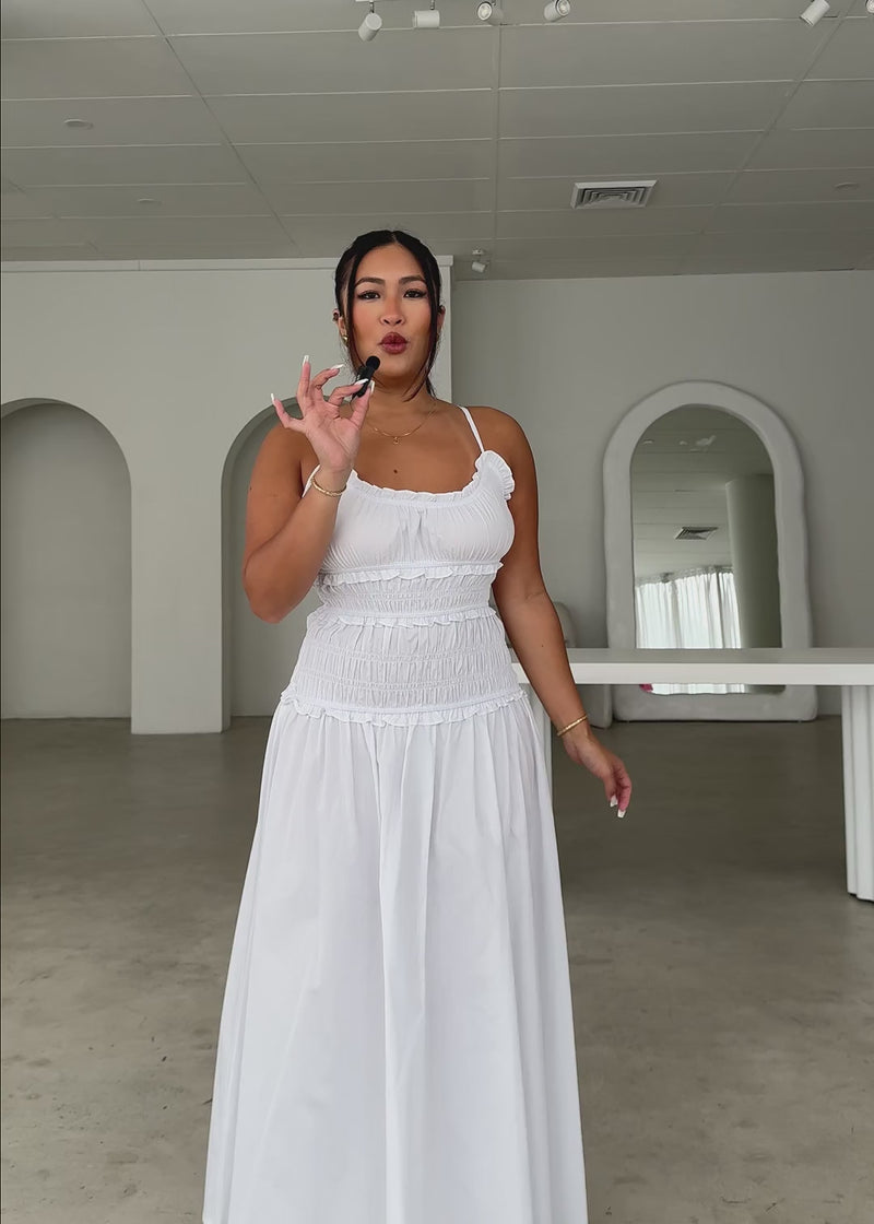 Romantic yet refined, the Rihana Maxi Dress in Off White is your go-to for sunset dinners or beach soirées. Pair with statement earrings and neutral wedges for a timeless summer look.