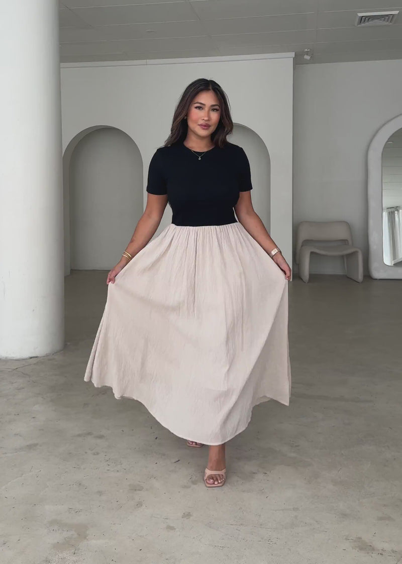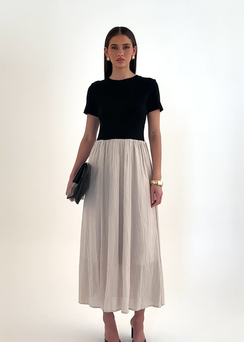 Stand out in the effortlessly chic Riptide Maxi Dress, designed to look like two pieces but styled as one. Pair it with loose curls held back by a jewelled hair clip for a touch of glamour. Complete the outfit with a neutral tote bag, subtle gold stud earrings, and classic nude pumps for a look that’s both sophisticated and versatile.