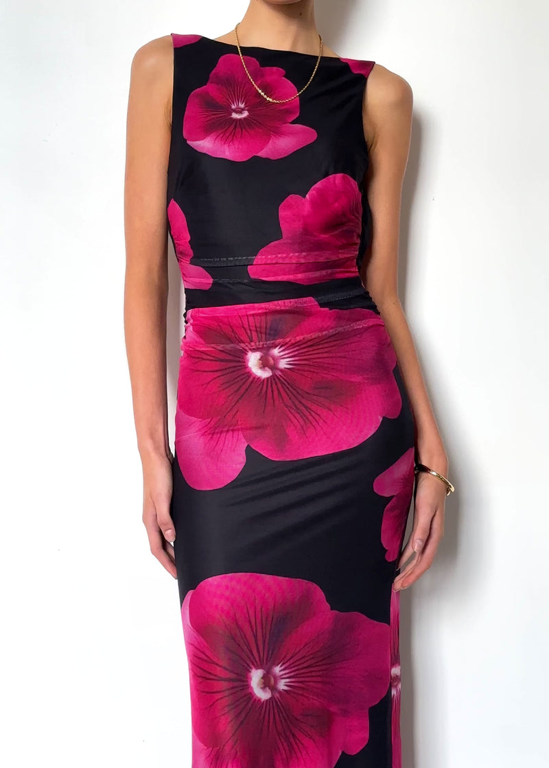 Romantic yet effortlessly cool. The Rivka Mesh Maxi Dress in Black Floral features a sheer mesh overlay with delicate floral detailing, creating a statement silhouette. Style it with strappy heels and minimal accessories for an elevated evening look.