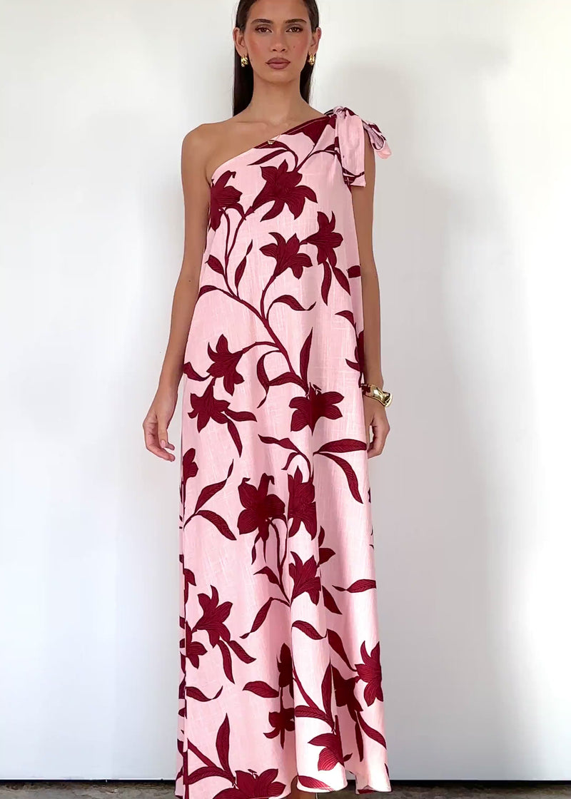 Feminine and bold, the Safiya One Shoulder Maxi Dress in Chloe Pink is perfect for weddings, parties, and long lunches. Pair with heels, a clutch, and statement earrings for confident event styling.