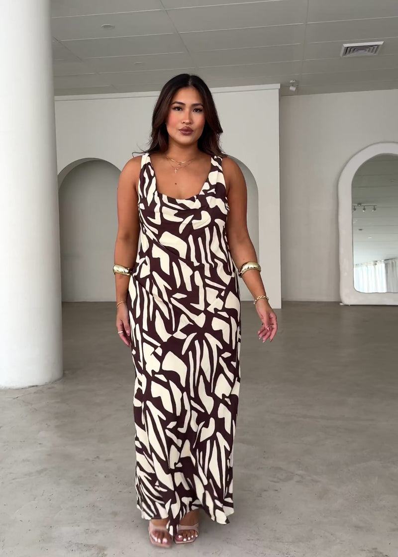 Make a statement in the Sambar Maxi Dress in Choc Vanilla. Its chic print and flattering silhouette create the perfect balance of elegance and ease. Wear it with a polished low ponytail, pearl drop earrings, and strappy heels for a sophisticated finish. A woven handbag adds a stylish touch.