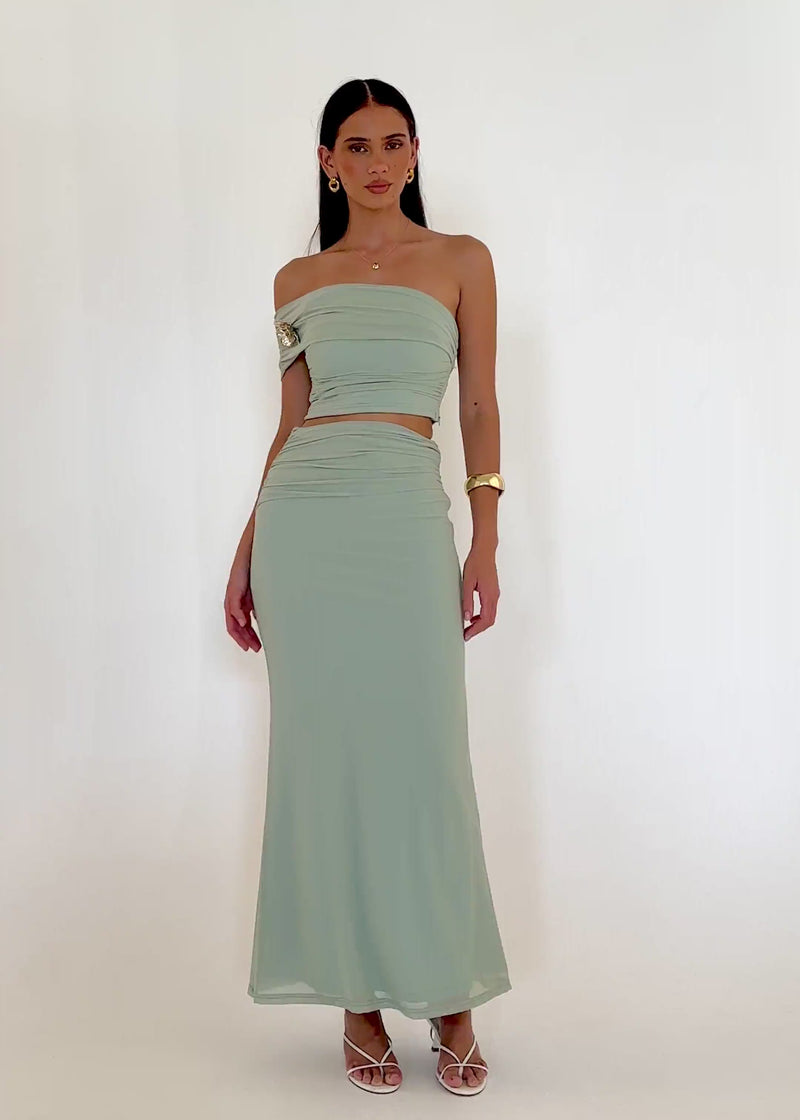 Keep it soft yet striking in the Santanna Mesh Crop in Sage. Style it with the matching Santanna Mesh Maxi Skirt for a dreamy co-ord vibe, or tuck into a white mini skirt for brunch.