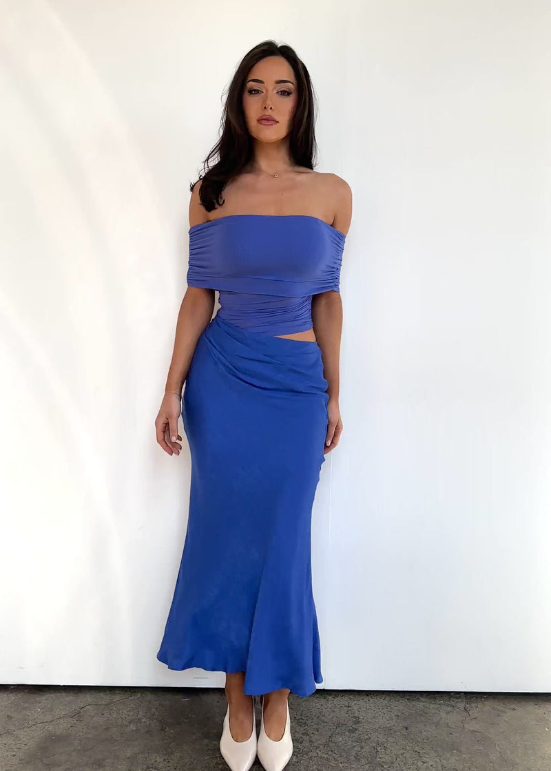 Elegant and playful, the Sapphira Off Shoulder Maxi Dress - Azure pairs with metallic sandals and layered necklaces for beachy vibes, or with wedges and a crossbody bag for city strolls. A breezy silhouette that flatters every step.