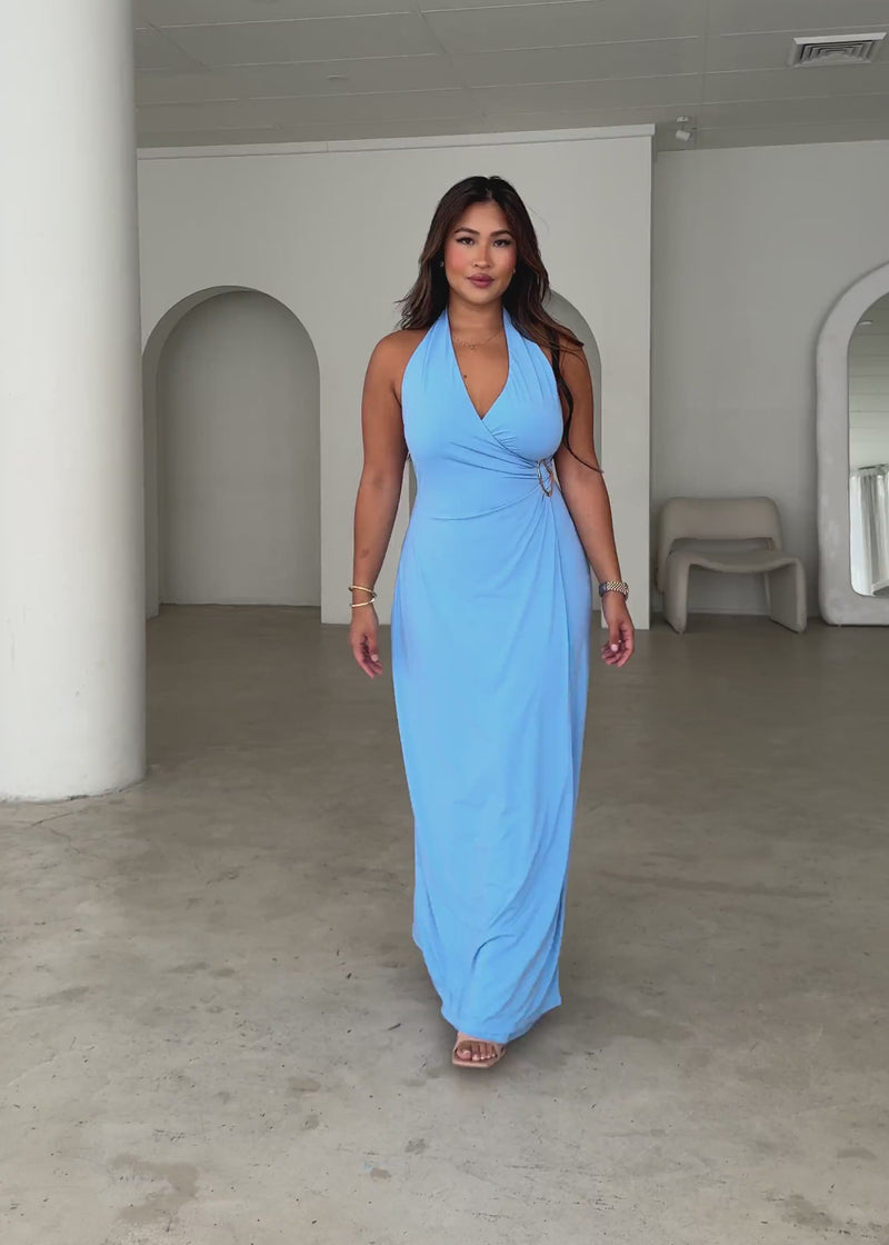 Easy and breezy, the Saskie Halter Maxi Dress in blue feels right for holidays and weekend outings. Just add gold hoops and flat sandals for day or take it into night with wedges and a sleek clutch.