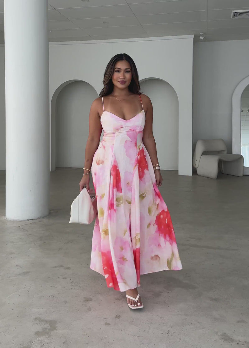 Flow into summer with the Selina Maxi Dress - Blush Garden. Perfect for garden parties, weddings, or brunch dates, this floral maxi dress pairs with nude heels and a clutch for effortless charm.