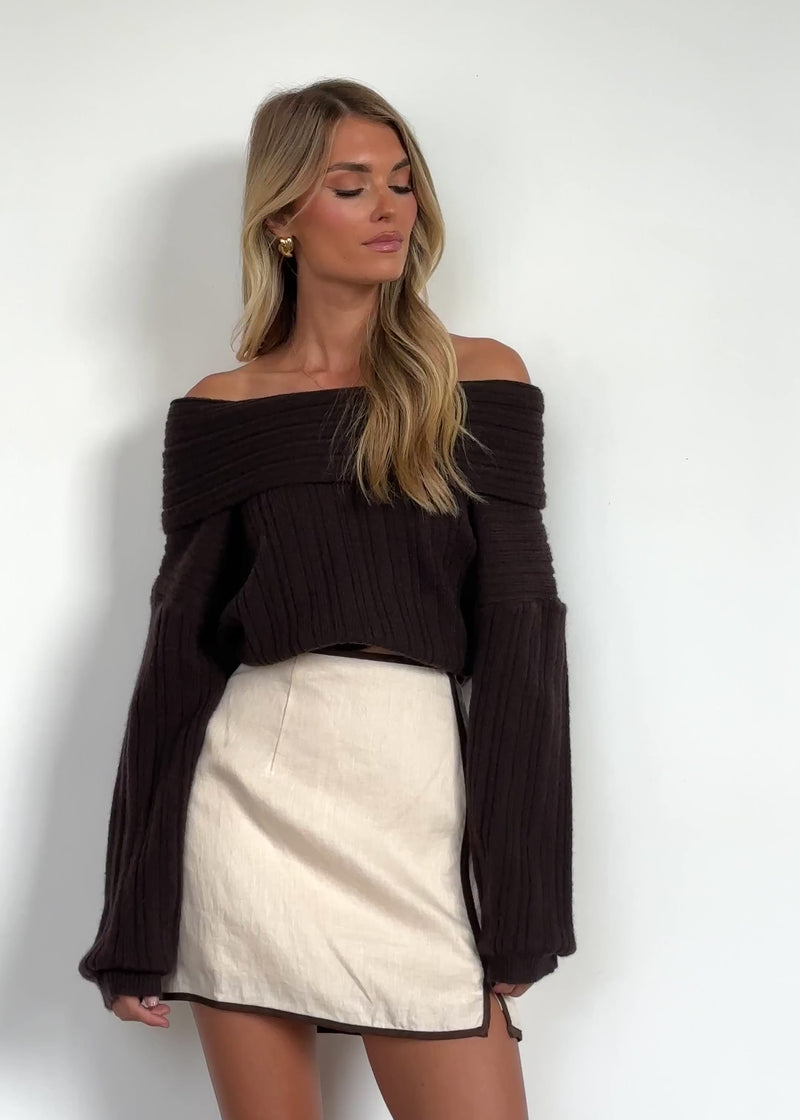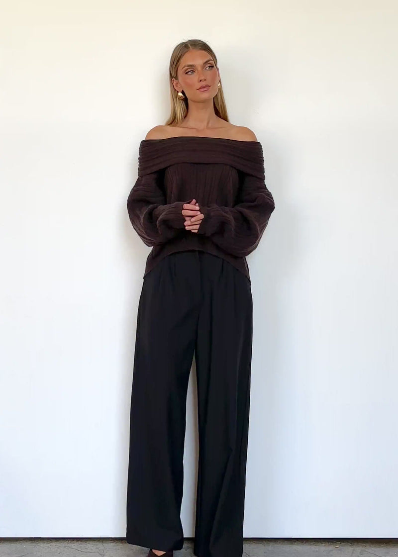 Shiloh Off Shoulder Sweater in Espresso brings a soft, slouchy charm with a flattering neckline. Tuck into denim or pair with a satin midi skirt and boots for a cosy-meets-chic autumn outfit.