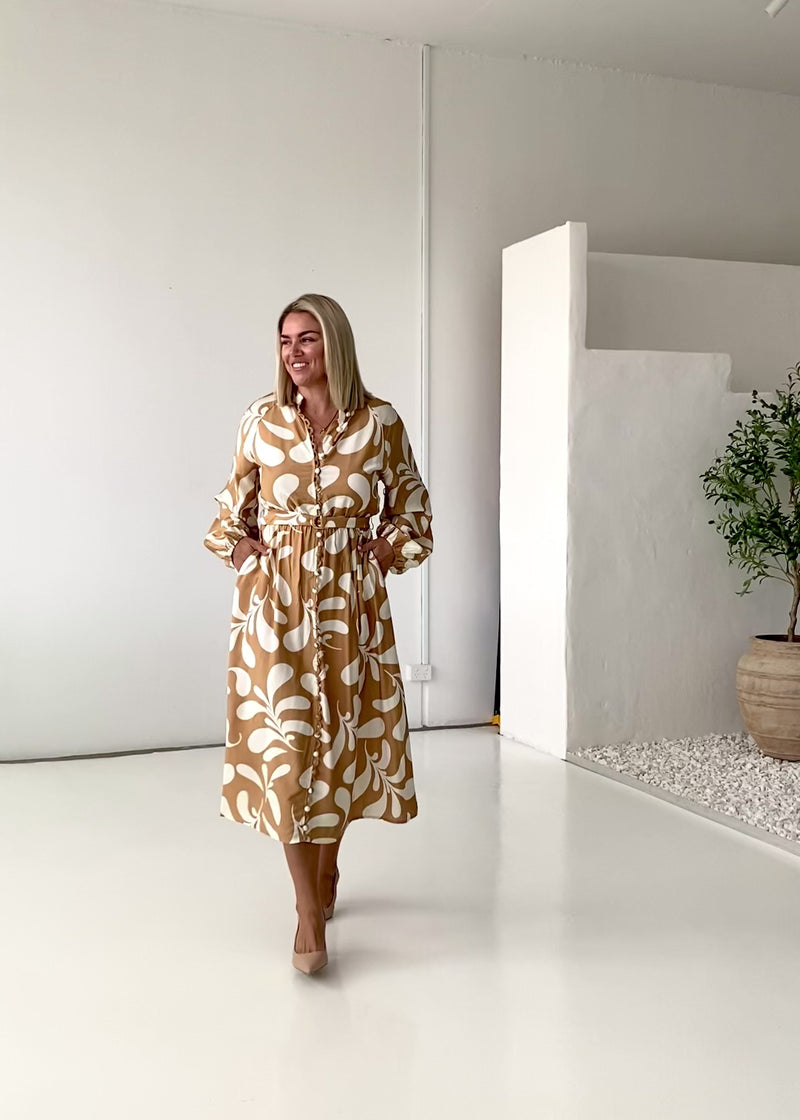 If you're into earthy tones with a playful twist, the Camel Swirl version of the Shylah Dress will be right up your alley. Style it with tan boots, a crossbody and soft waves for weekend chic, or dress it up with heels and bold earrings for dinner plans.