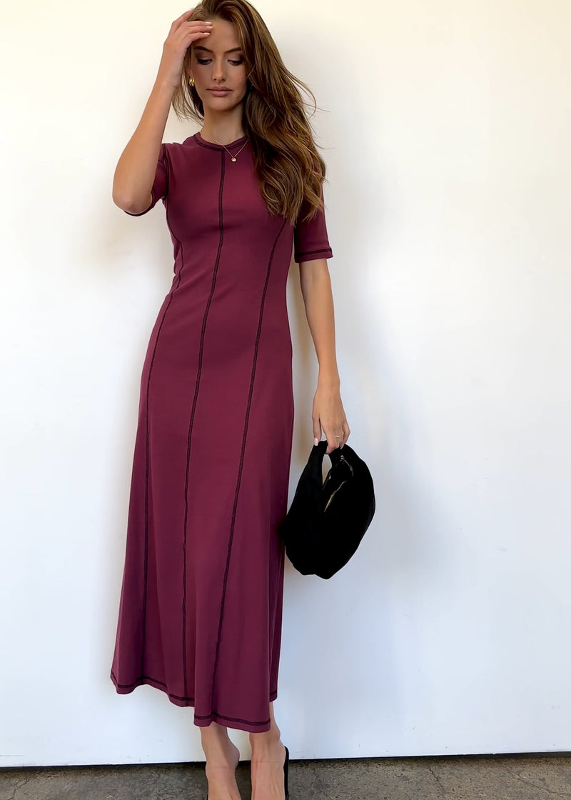 Smart and striking, the Simba Midi Dress in Burgundy brings a bold twist to a classic cut. With elbow-grazing sleeves and contrast stitch lines, it gives a flattering, elongated look. Team it with white pumps, a boxy clutch, and oversized sunnies for that off-duty edge.