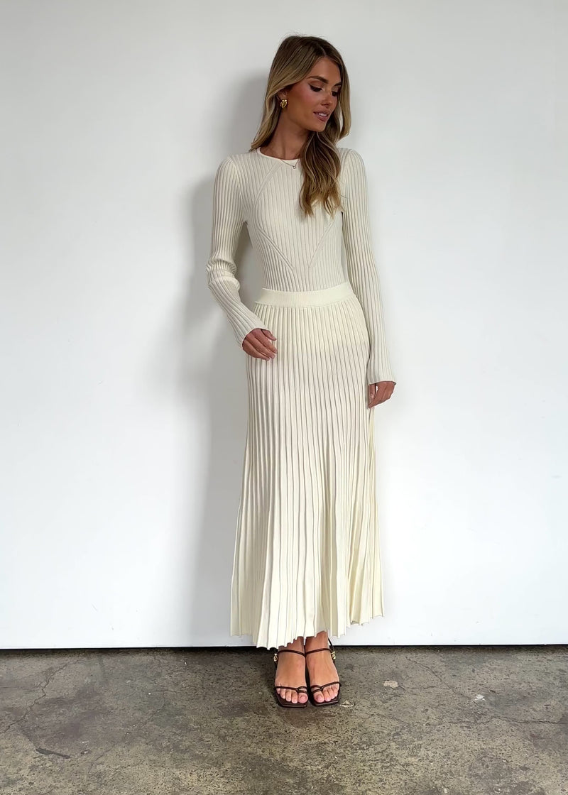 Simple, clean, and endlessly wearable—the Skylee Knit Maxi Skirt in Cream is a wardrobe must. Style it with the Skylee Knit Top in Cream for a fresh, monochrome moment. Finish with slides and a woven tote for relaxed days out.