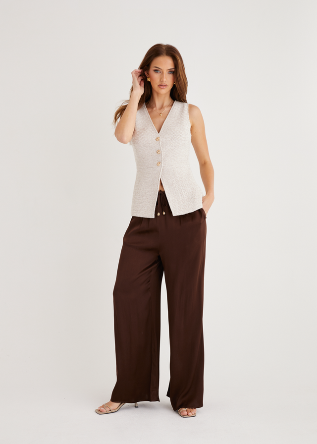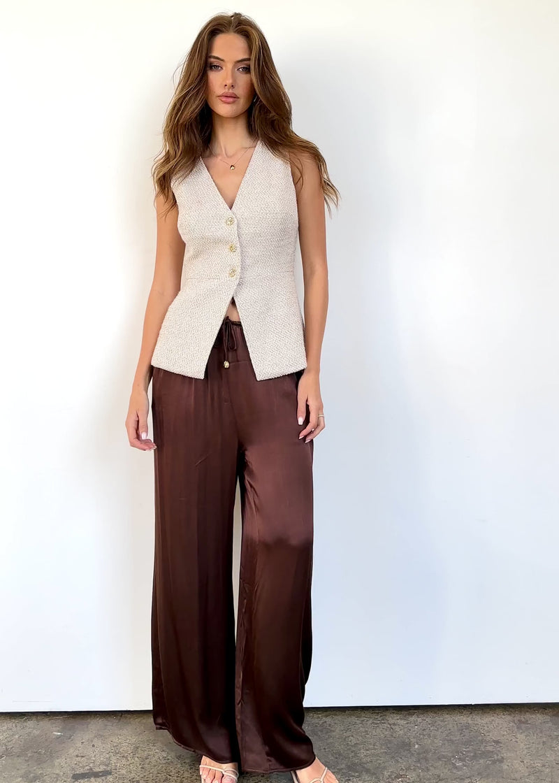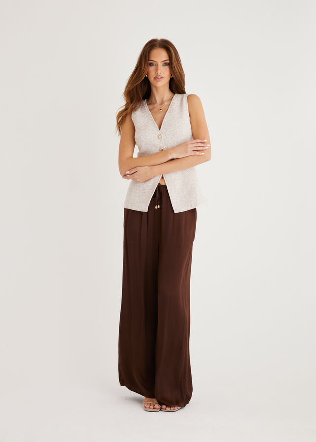 A fresh base for everyday looks, the Sofia Vest in oat marl is easy to dress up or down. Tuck into wide-leg trousers or layer under an open shirt. Add slides, a crossbody, and gold hoops for a polished finish.