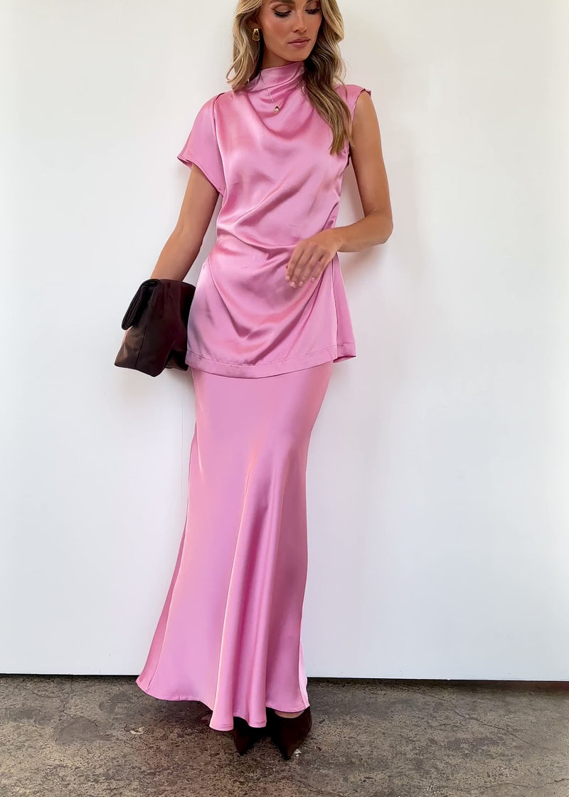 The Solace Maxi Skirt in Pink is the kind of piece that speaks for itself. Designed to be worn with the matching Solace Top, it’s a dreamy look styled with white heels, soft glam makeup, and gold studs.