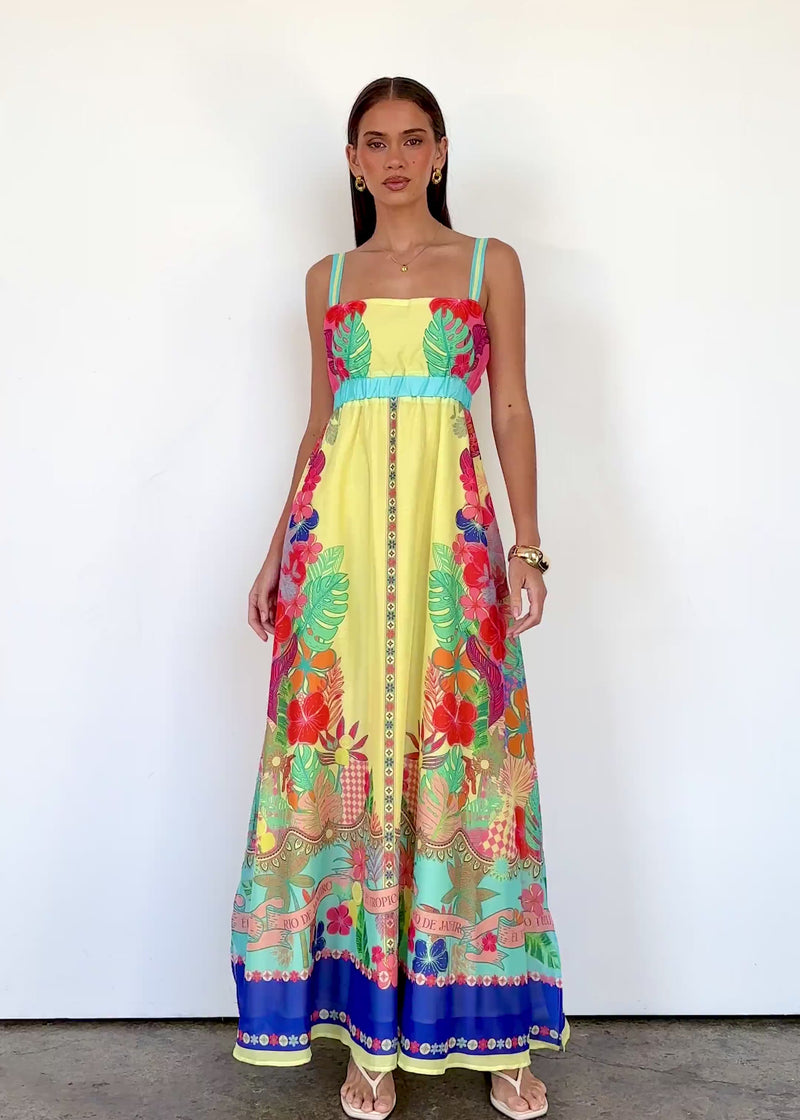 Bring vacation energy everywhere in the Soraia Maxi Dress – Rio de Janeiro. Perfect for beach dinners, holiday photos, or warm-weather events. Pair with wedges and statement earrings. Add to cart and live your bold tropical fantasy!