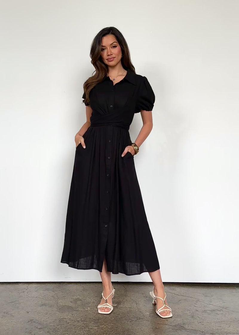 Simplicity meets elegance in the Taja Midi Dress in black. Pair with metallic heels and a satin clutch for events, or white sneakers and a denim jacket for weekend brunches.
