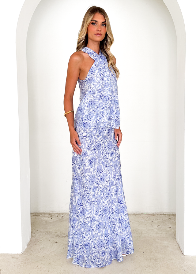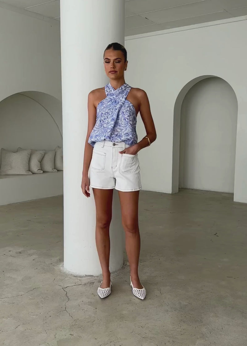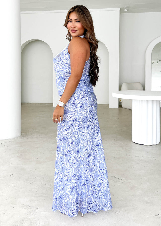 The Tammy Top in Blue Floral offers timeless charm. For an elevated look, pair it with the matching maxi skirt or neutral high-waisted shorts. Add a pearl-embellished headband, nude wedges, and a crossbody bag for a polished daytime outfit. Don’t miss out—add the Tammy Top to your collection today!