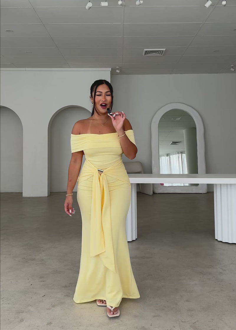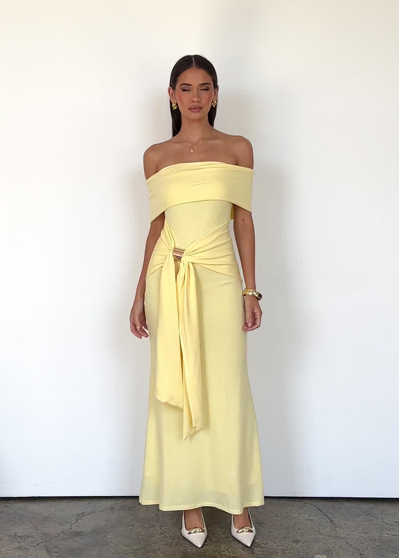 Sunshine in a dress, the Tania Off Shoulder Maxi Dress brings instant brightness to your look. Pair with espadrilles and woven accessories for a resort-ready vibe.
