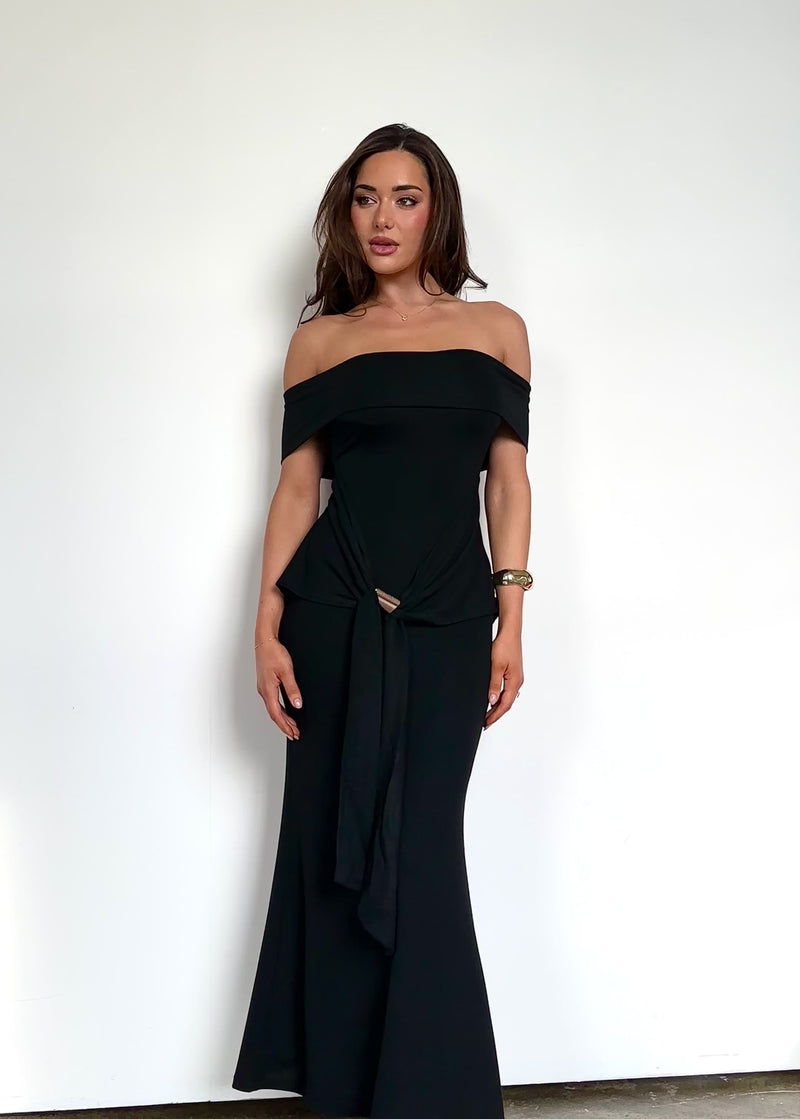 The Tania Off Shoulder Midi Dress - Black nails the balance between timeless and flirty. Style it with sleek stilettos, gold hoops, and a mini bag for the ultimate after-dark look.