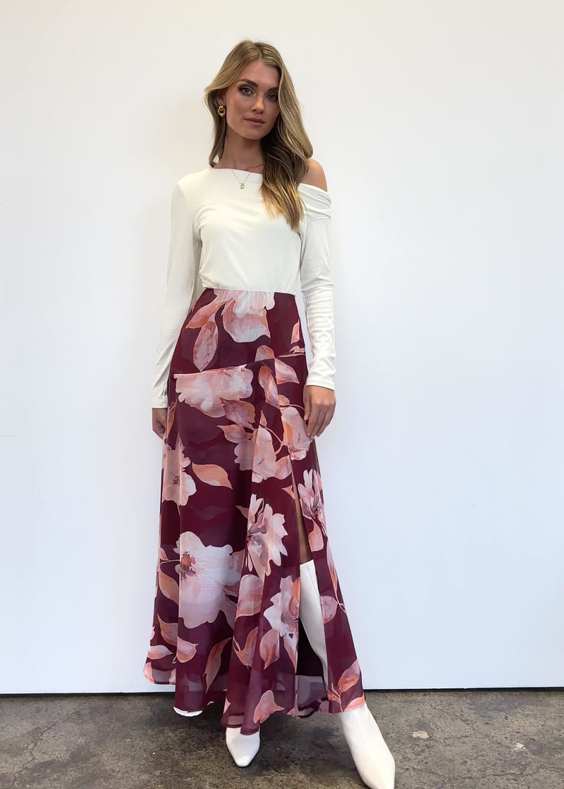 Flowing and feminine, the Tatum Maxi Skirt in Burgundy Floral is a staple for effortless elegance. Style it with the matching off-shoulder top for a head-turning set, or pair it with a fitted knit and sandals for a chic everyday ensemble.
