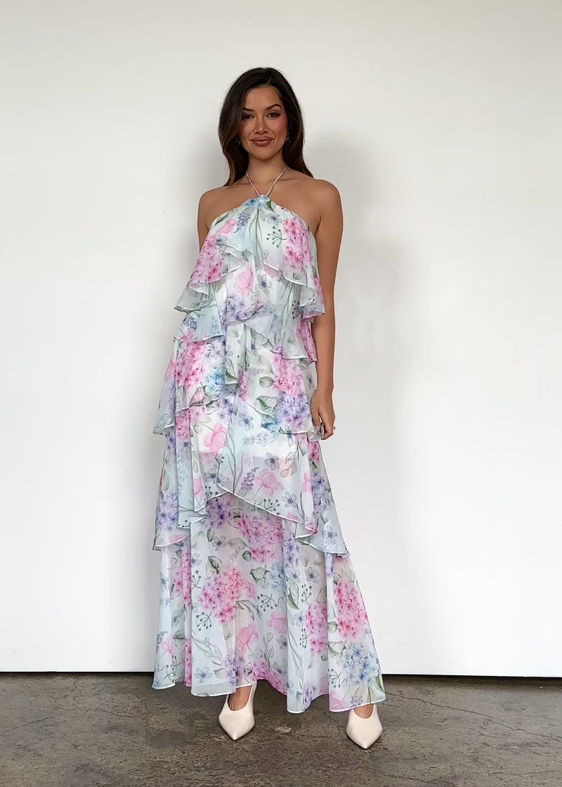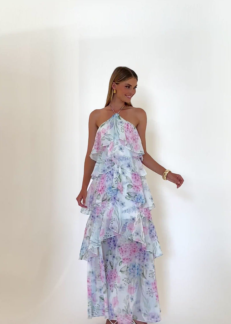 Light, flowy, and perfect for sunny escapes — the Telaena Halter Maxi Dress in Aqua Floral is a beach-to-dinner dream. Add white heels and shell earrings for that vacay glow.